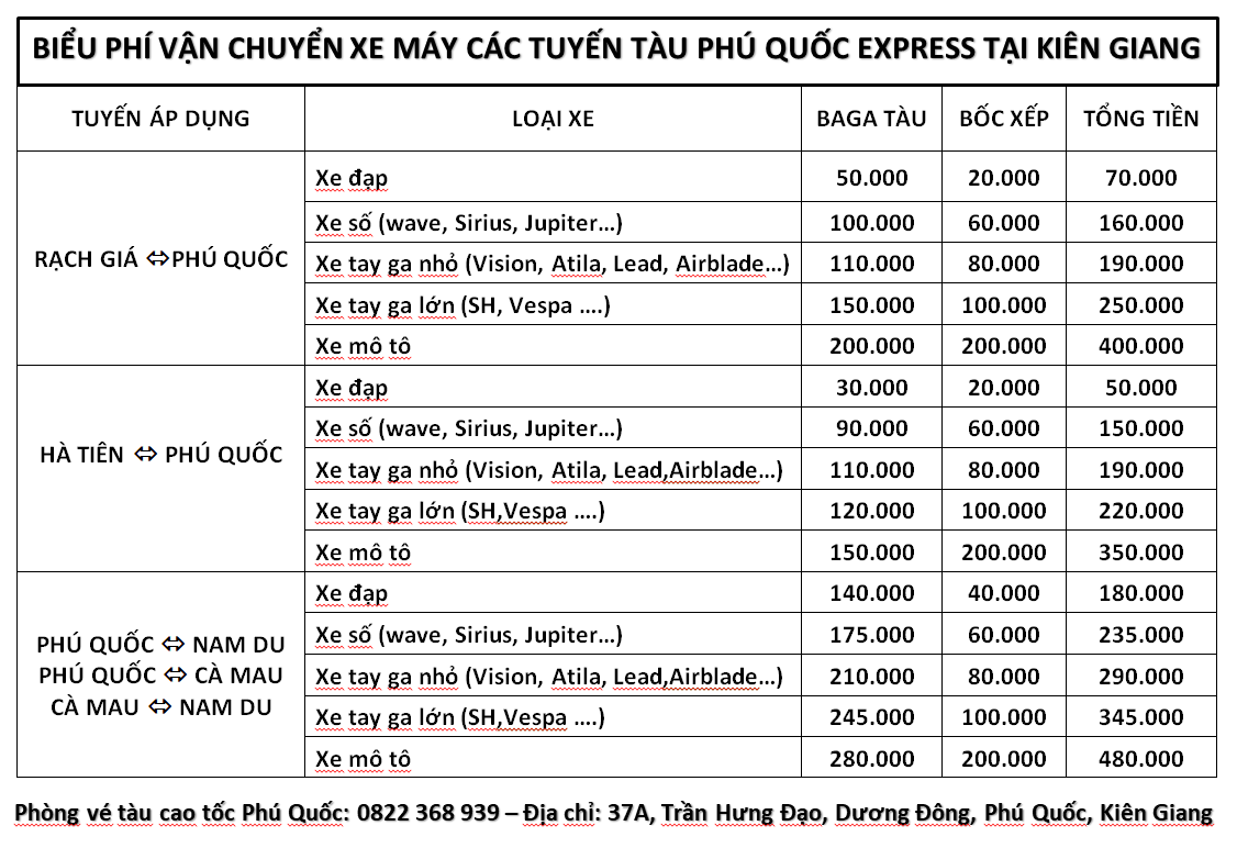– Biểu phí vận chuyển xe máy theo tàu cao tốc Phú Quốc Express trong bảng bên dưới là áp dụng cho 1 lượt (chặng).
